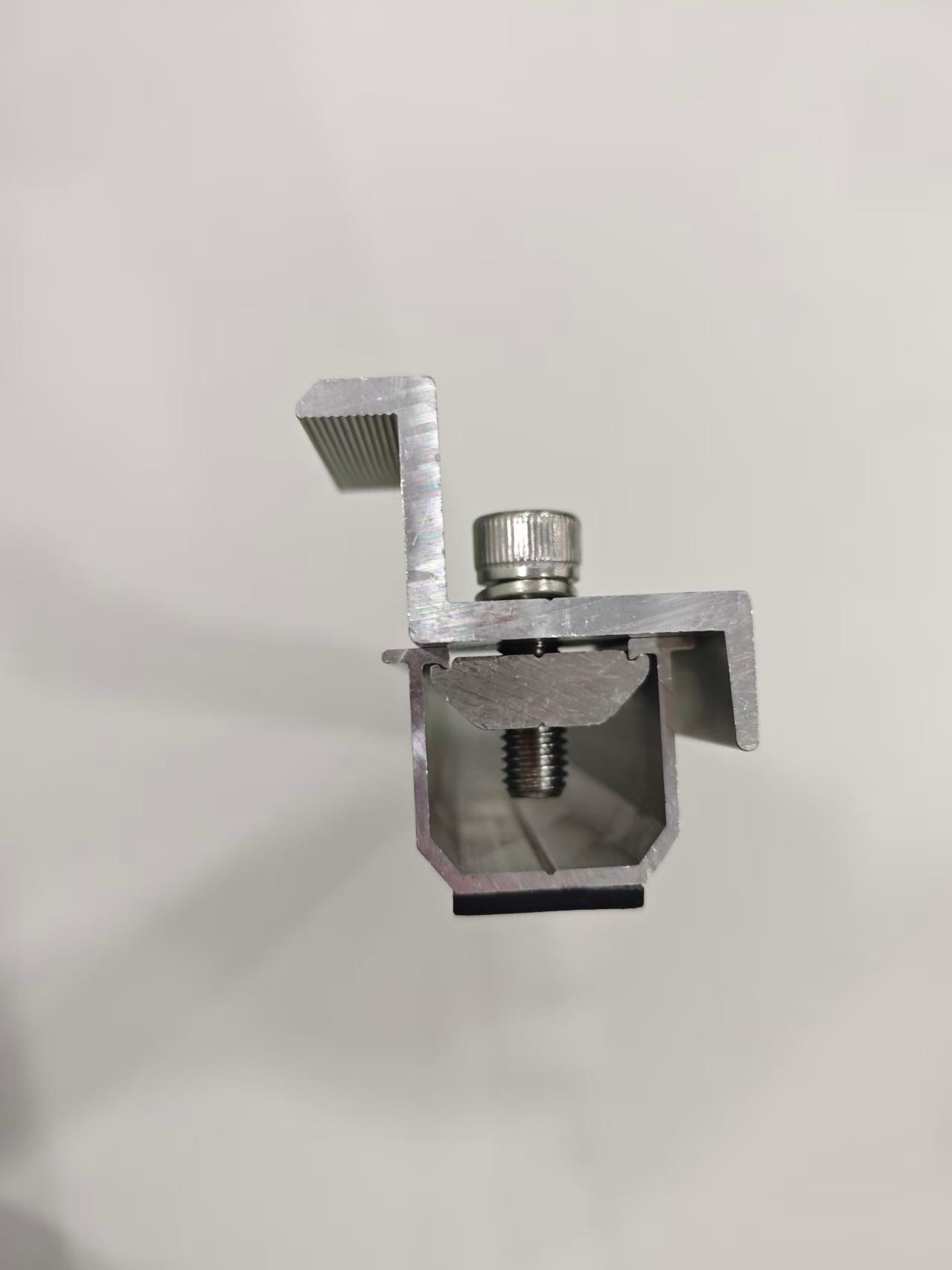 3. Ansin cuir isteach an clamp deireadh lár agus an clamp lár isteach sa rian agus níos doichte na boltaí. Le linn an phróisis seo, ní mór an painéal fótavoltach a chur ag an am céanna.